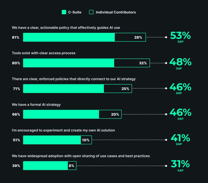 Bu %53'lük fark, yapay zeka çağında şirketlerin karşılaştığı en büyük meydan okumalardan birini özetliyor: Strateji ile uygulama arasındaki kopukluk. Liderler, yapay zeka yatırımlarının ve politikalarının varlığına odaklanırken, bu politikaların çalışan seviyesinde ne kadar anlaşıldığı, benimsendiği ve değer yarattığı gözden kaçıyor. Raporun diğer bulguları da bu boşluğu derinleştiriyor: