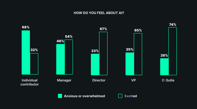 - Heyecan vs. Kaygı: C-seviye yöneticilerin %74'ü yapay zeka konusunda heyecanlıyken, bireysel çalışanların sadece %32'si heyecan duyuyor. Çoğu çalışan kaygılı veya bunalmış durumda.