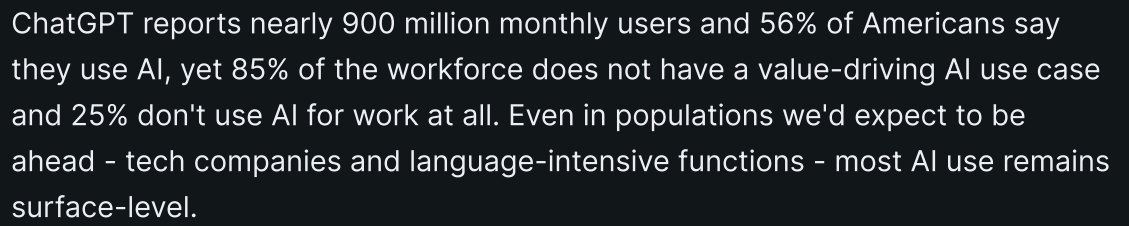 Rapor, yapay zekanın yaygınlığına rağmen, iş gücünün %85'inin yapay zekayı değer yaratan bir kullanım senaryosuyla kullanmadığını belirtiyor. Hatta %25'i iş yerinde yapay zekayı hiç kullanmıyor. Bu durum, "Yapay Zeka Çölü" olarak adlandırılıyor.