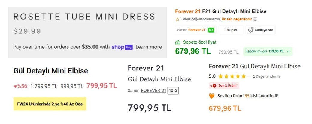 Forever 21, globalde e-ticarette geç kaldığı için eleştirilen bir marka. Hala daha lifestyle çekimleri fena olmasa da stüdyo çekimlerinin pazarın çok altında kalitede olduğunu ve çok demode kaldığını düşünüyorum. Türkiye’de de yeniden çekim maliyetine girmek yerine mevcut ürün çekimleri kulandılığı için web sitelerinde ürünler bence kendini göstermiyor.